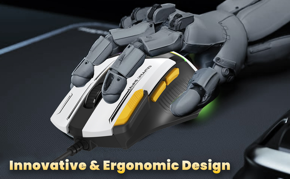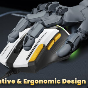 The GM333 White Edition Gaming Mouse features a striking white-and-black design accented with yellow buttons and a vibrant RGB strip that wraps the front edge. Its ergonomic shape includes a deep thumb rest and textured grip, ensuring secure handling even during intense gameplay.