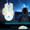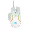 The GM320 Gaming Mouse features a striking white design accented with RGB light strips that run along the sides and surround the scroll wheel, giving it a futuristic and visually appealing look. The ergonomic shape includes sculpted grooves for improved hand placement and comfort, along with extra side buttons strategically positioned for quick and easy access during gameplay.