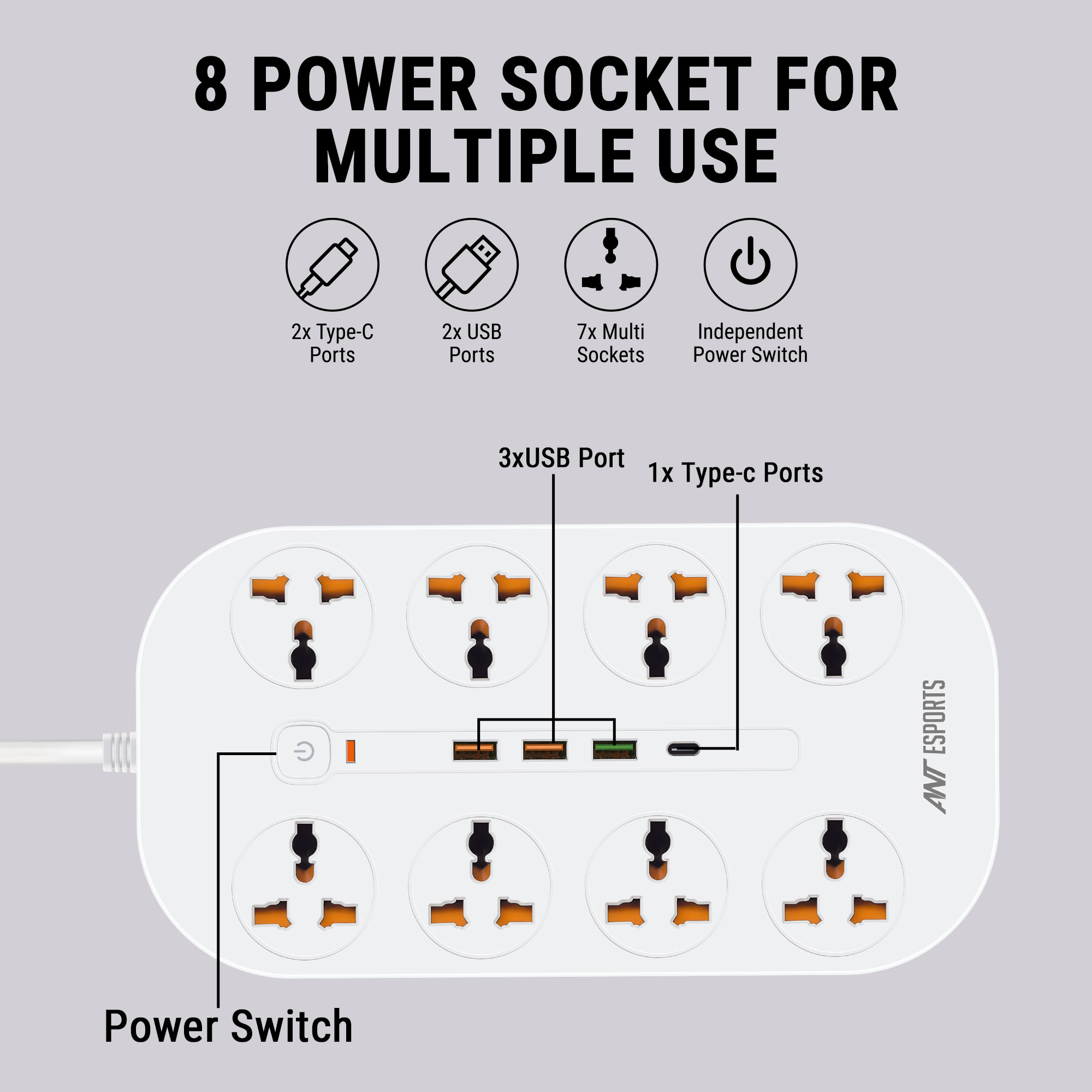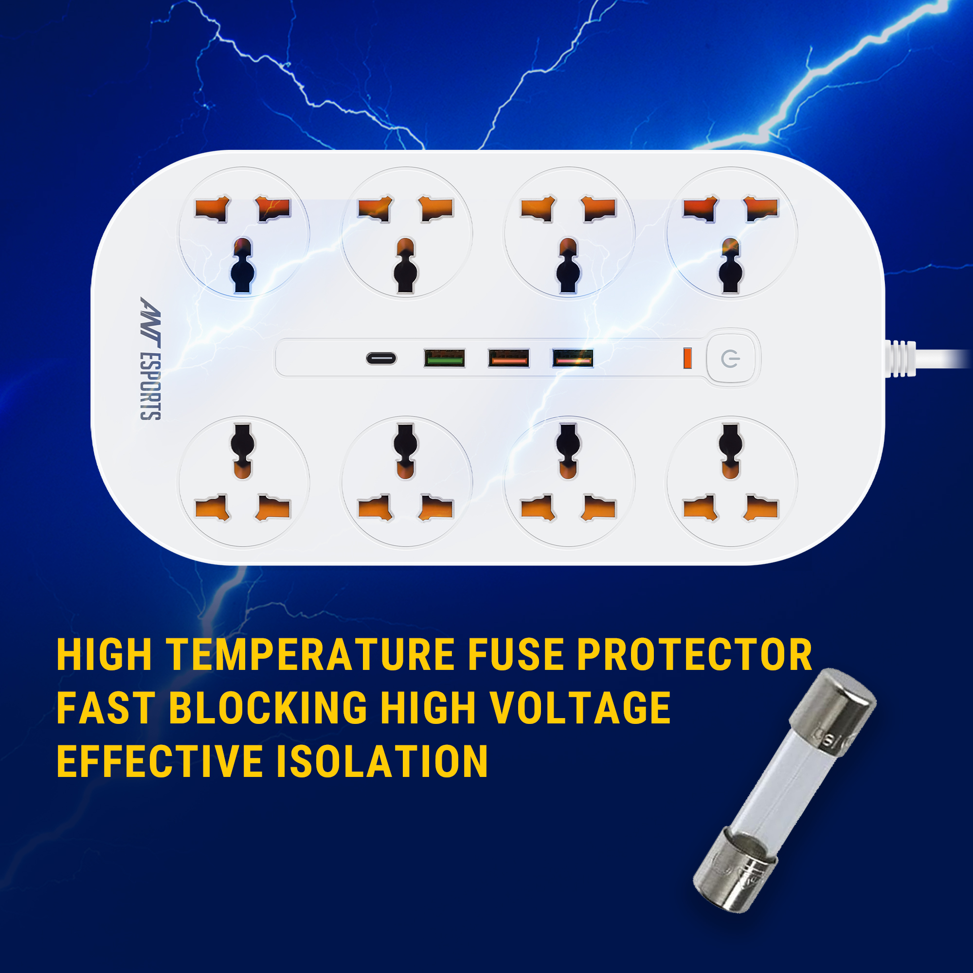 - Expanded Connectivity with Multiple Ports: The Ant Esports PS831 power strip provides a comprehensive power solution with eight three-pin power connectors, three USB Type-A ports, and one USB Type-C port. This expanded connectivity allows users to power multiple electronic devices simultaneously, from traditional appliances to modern gadgets like smartphones and tablets.