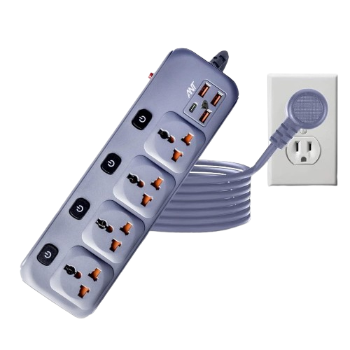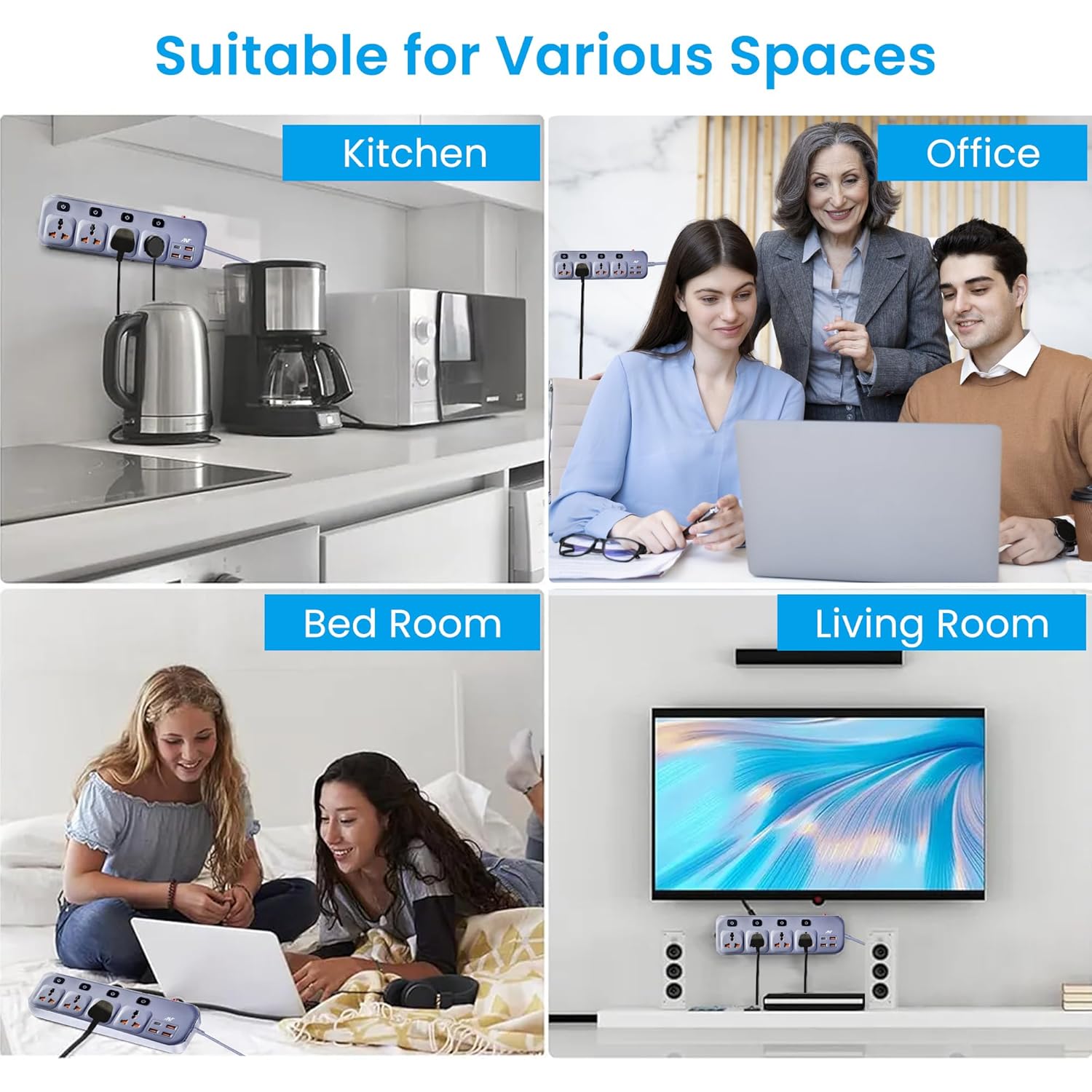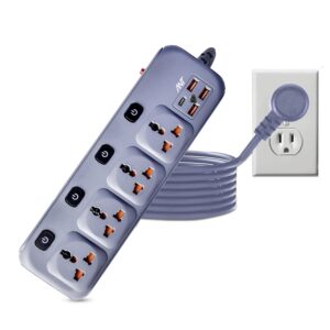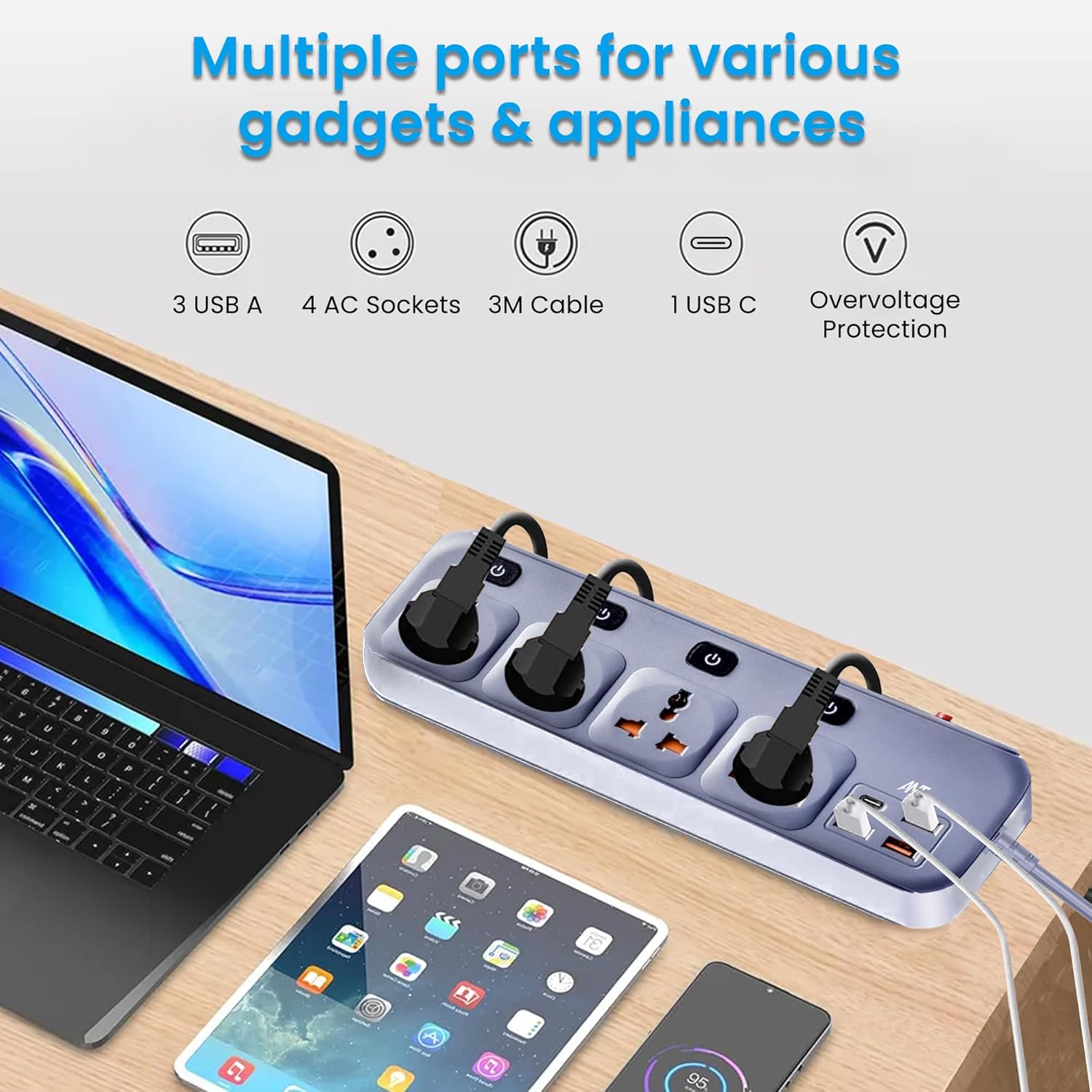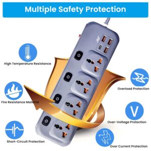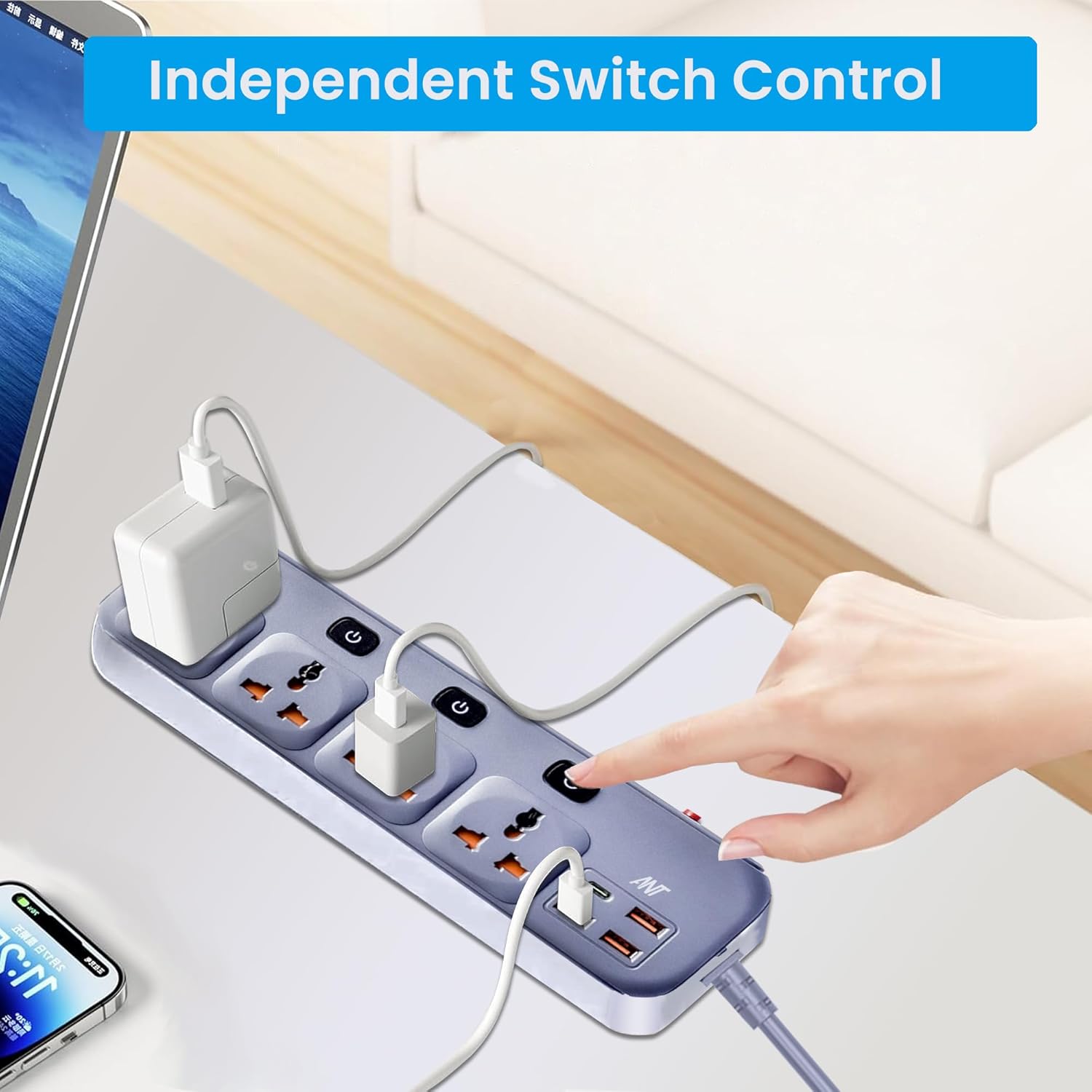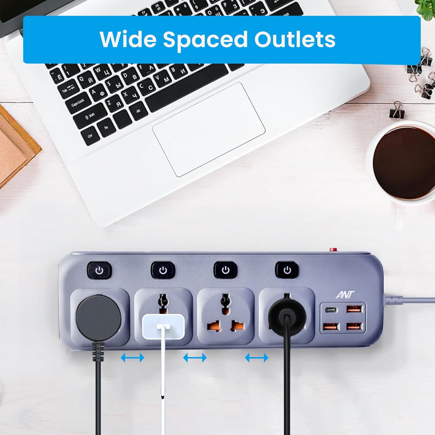 ANT PS431 Power Strip Individual Power Switch,10ft Universal Extension Cord 4 AC Outlets 3USB 1Type C PD Port, Max 2500W, 220-250v, Multiple Outlet Extender for Home Office Store_ Grey